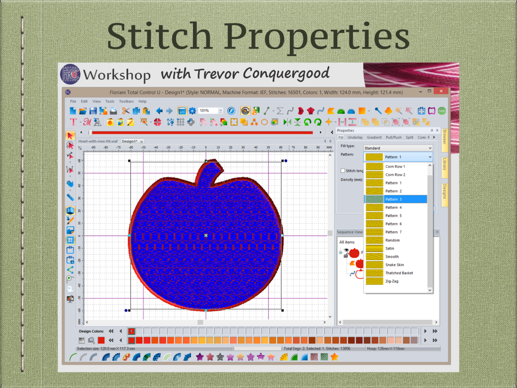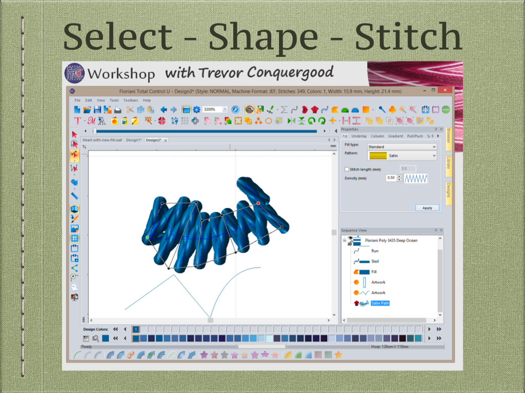 Class begins with a short overview of how the program works. Learn about segment based embroidery and how we can use the software to fill in shapes with stitching. You really do have “Total Control” of the results by choosing the stitch style and adjusting the properties.