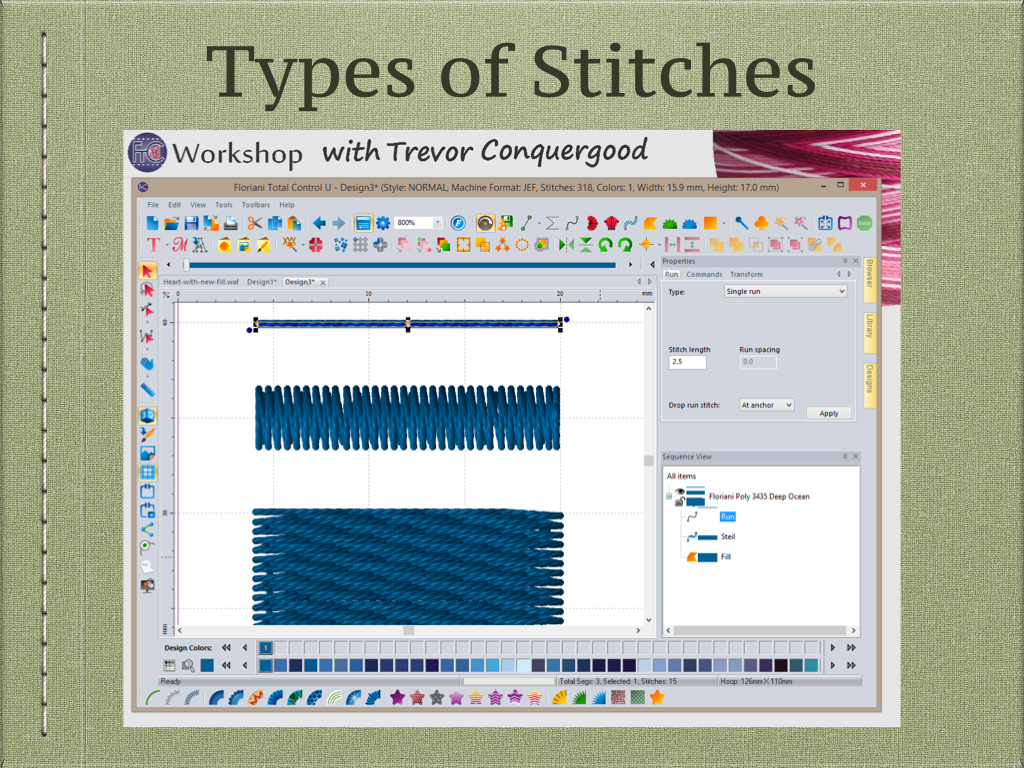 Choose the type of stitch you want from the toolbar and then make fine adjustments in the properties box. The basic types of stitches are run, satin and fill but there are many specialty types of stitches such as appliqué, motif fill, wave fill and many others.