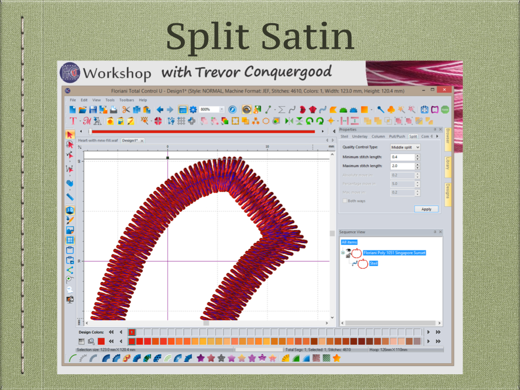You can split a long satin stitch shape into a split satin with the tab on the properties box. You can choose from center split or offset the split to either side. You can adjust the minimum length to split. If you choose random the software makes it less noticeable.