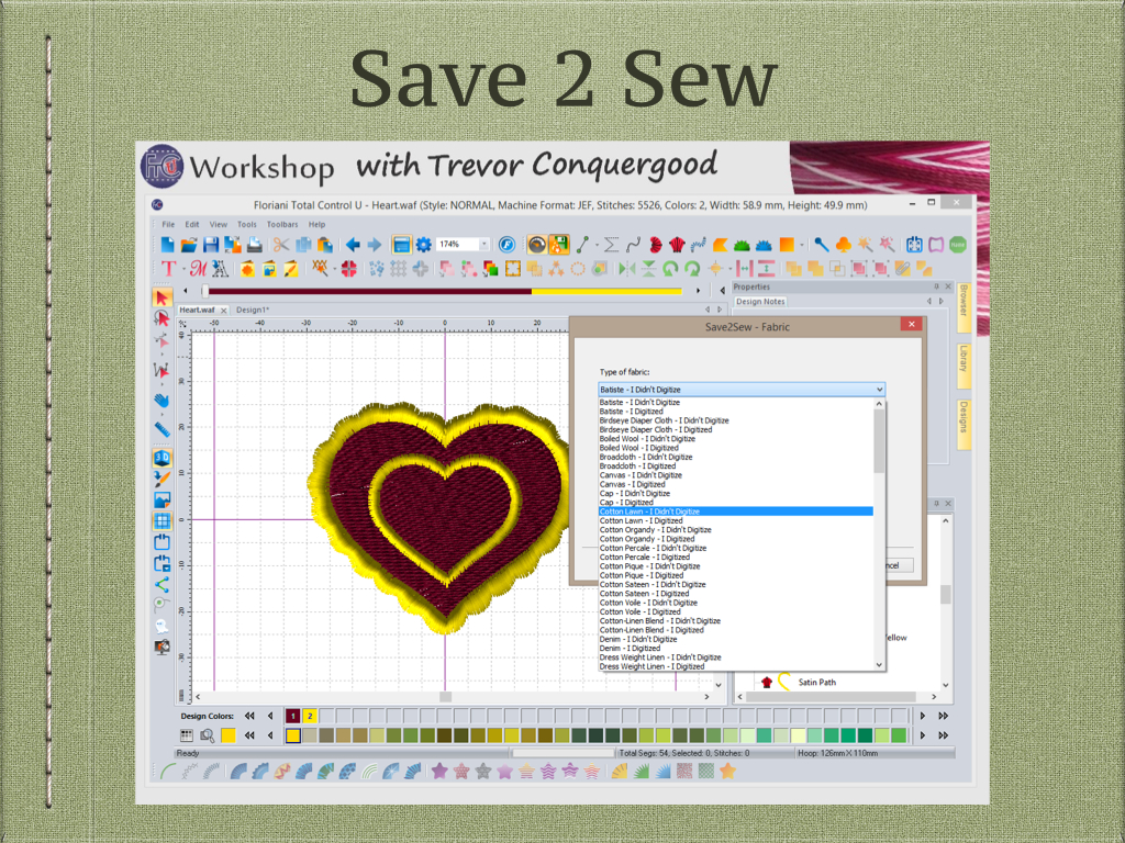 All of the intelligence in the software is aloud to shine with the save 2 sew tool. You simply choose the fabric you want to sew on and the software will make adjustments to the segment properties to improve the results. It will also provide you with a valuable sewing tip.
